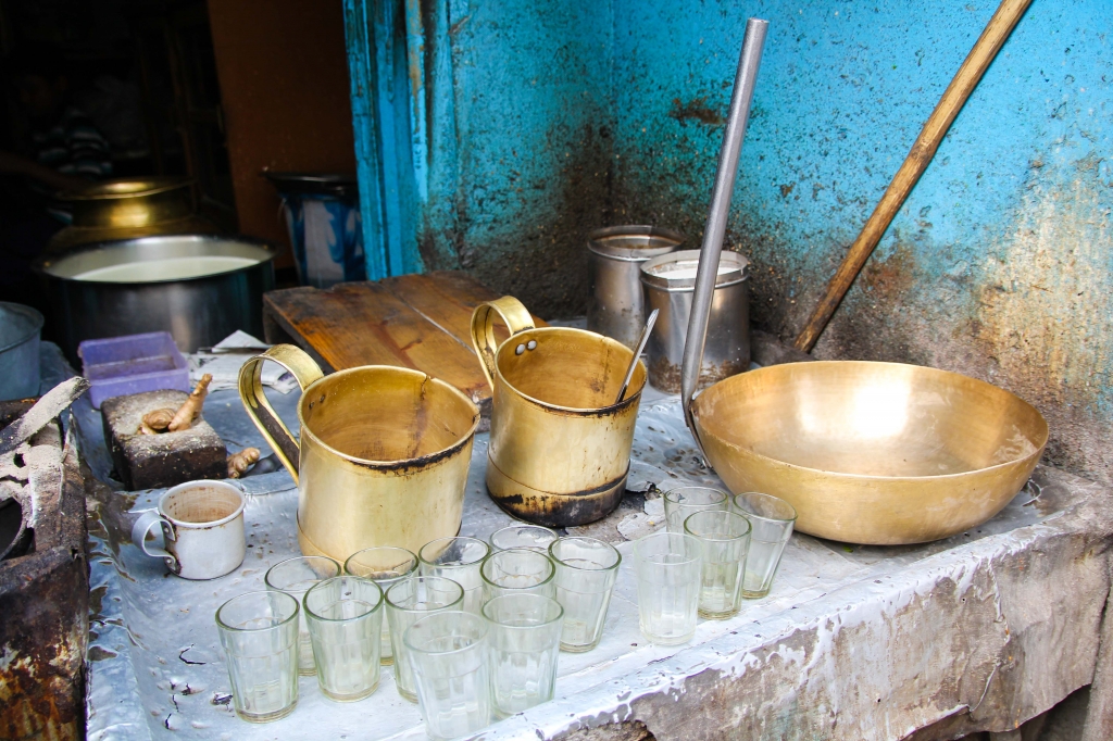 ← These days, most passengers drink chai served by railway employees on the train → Chai set-up at a train station